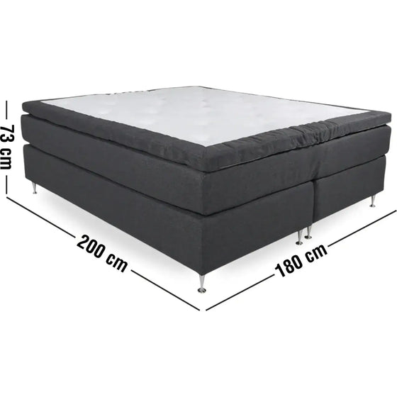 Älvdalen kontinentalseng er skabt til dig, der vil kombinere stilrent design med maksimal komfort. Den er betrukket med et slidstærkt mørkegrå møbelstof, der giver et moderne og sofistikeret udtryk, mens de elegante metalben løfter sengen og tilfører lethed. Med sit høje design bliver Älvdalen hurtigt et funktionelt og dekorativt midtpunkt i soveværelset.