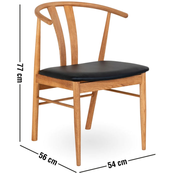 Den buede ryg omslutter dig blidt, mens sædet giver en behagelig komfort, du mærker allerede efter første kop kaffe. Med sit slanke stel i i matlakeret massiv eg og sit tidløse design føles stolen både let i rummet og varm ved bordet.