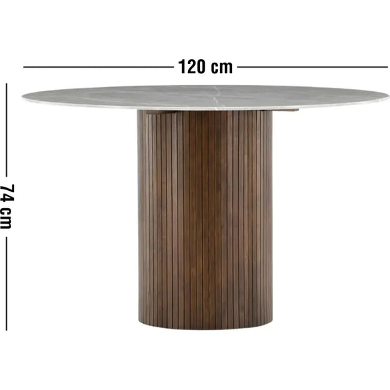 Dette spisebord tilhører Vind-kollektionen og har en cylindrisk ramme i riflet, mørkebrunt træ og en rund bordplade i sten, der giver et vidunderligt liv til blikfanget. Et rundt spisebord er perfekt til at skabe fællesskab ved måltiderne, her ender ingen på kanten.