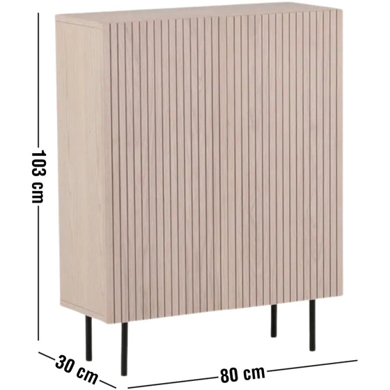 Dette høje opbevaringsskab fra Björkön-serien kombinerer funktionalitet med et tidløst, elegant design, der hurtigt bliver et blikfang i ethvert rum. Skabet er udstyret med to låger i et ribbet look og tre rummelige hylder, som giver skjult opbevaring til alt fra entrémøbler til kontorartikler og stueudstyr. Det er fremstillet i finér med en flot overfladebehandling og står på smalle ben i sort stål, hvilket giver et let og moderne udtryk.