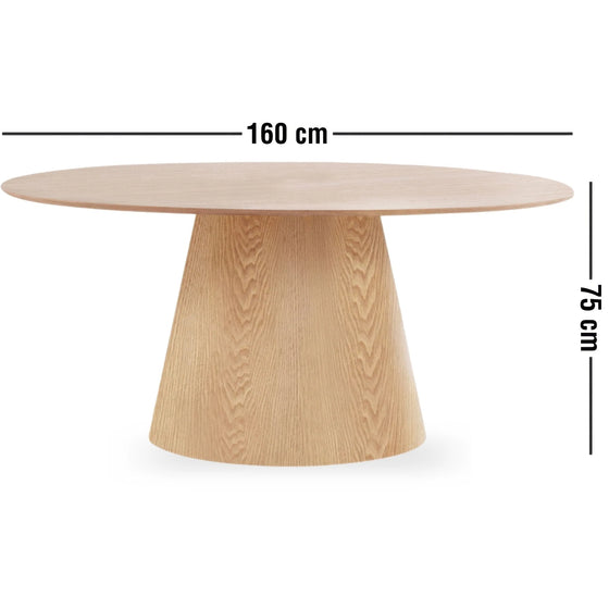 Aflangt spisebord med afrundede ender. Bordets top og base er lavet i lakeret valnødfinér eller lakeret naturfarvet askefinér. Bordet har plads til 6 personer.