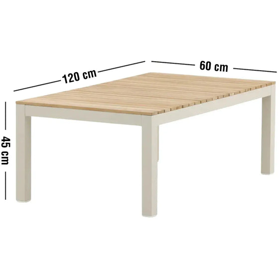 Brasillia-sofabordet den ultimative tilføjelse til din udendørs sofagruppe og giver dig en overflade at både nyde og blive nydt. Brasillia sofabordet er lavet af aluminium og teak, hvilket garanterer både holdbarhed og en tidløs æstetik. Aluminium giver bordet en let og rustbestandig struktur, der kan modstå alle vejrforhold, mens teaktræets naturlige skønhed og varme tilføjer et strejf af elegance til dit udendørsmiljø.