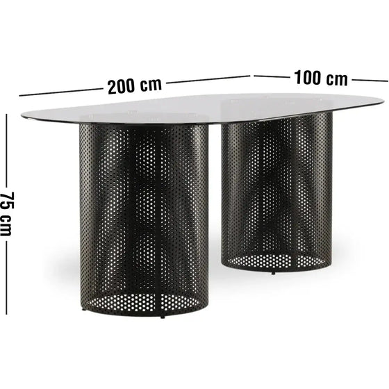 Bordpladen er oval i klart glas, hvilket giver en luksuriøs elegance til det samlede indtryk. De to cylinderformede ben er robuste i sort stål og har et smagfuldt industrielt design, der tiltrækker opmærksomhed.