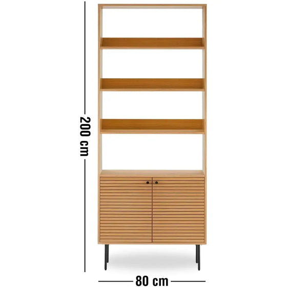 Kyoto-reolen byder på fire rummelige hylder og to praktiske låger, der giver dig både åben udstilling og skjult opbevaring. De lakerede overflader i natur eg tilfører varme og elegance, mens det pulverlakerede stålstel sikrer stabilitet og holdbarhed.