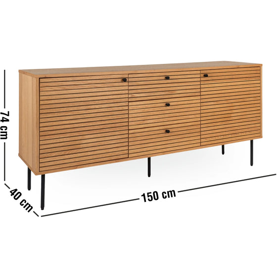 Skænk i matlakeret egefinér med 3 skuffer og to låger. Ben i sort pulverlakeret metal. Maxbelastning 30 kg.