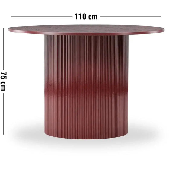 Giv din spisestue et nyt look med det elegante og moderne Lenox spisebord, en perfekt blanding af stil og funktionalitet. Bordet har en ensartet bordeauxrød farve på både den runde bordplade og det unikke runde ben, hvilket giver dit rum et distinkt og sofistikeret præg.