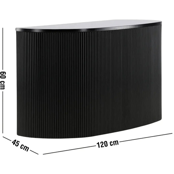Skænken er udført i solid MDF og behandlet med slidstærk, mat sort PU-lak, som sikrer en flot finish med dybde og karakter. Det afrundede formsprog og det taktile lameldesign skaber visuel dynamik og løfter indretningen med stilren kant.