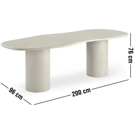 Ovalt spisebord med bordplade og søjleben i træ med mat cementbelægning. Det robuste design kombinerer naturlig elegance og moderne æstetik, hvilket gør bordet til et stilfuldt samlingspunkt i din spisestue.