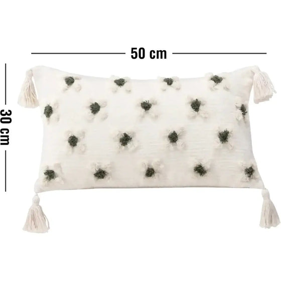 Dette aflange pudebetræk i en beige bundfarve har et charmerende blomstermønster i tuftet grønt og beige stof, der giver puden en lækker struktur. Med beige kvaster i hvert hjørne har puden et nostalgisk look, og der er en skjult lynlås i bunden.