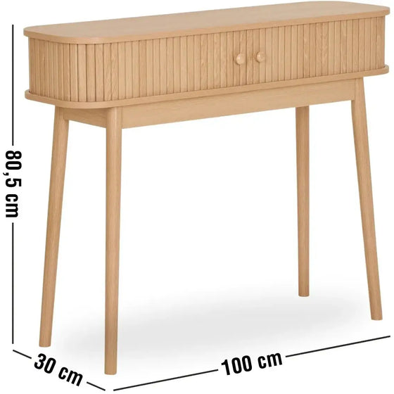 Nikko konsolbordet er et elegant møbel, der kombinerer naturlige materialer med et tidløst udtryk. Med sin slanke form og lyse træfinish tilfører det varme og ro til indretningen - perfekt til entréen, stuen eller soveværelset. Bordets to diskrete låger med lodrette riller skaber et moderne og raffineret udtryk, samtidig med at de giver praktisk opbevaring til småting, du ønsker at have lige ved hånden.