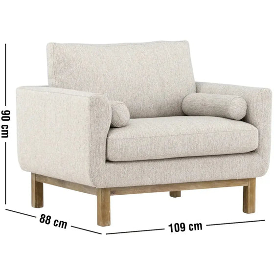 Olympos-lænestolen er mere end bare et møbel – det er en stilfuld ledsager, der også tilbyder en følelse af komfort, som du vil elske at synke ned i efter en lang dag. Med sit elegante beige polyesterbetræk og dekorative gummitræsstel tager denne tidløse lænestol komfort til en ny dimension. De afrundede armlæn og de medfølgende hynder er ikke kun en stilfuld detalje, de bidrager også til en mere behagelig siddeoplevelse.