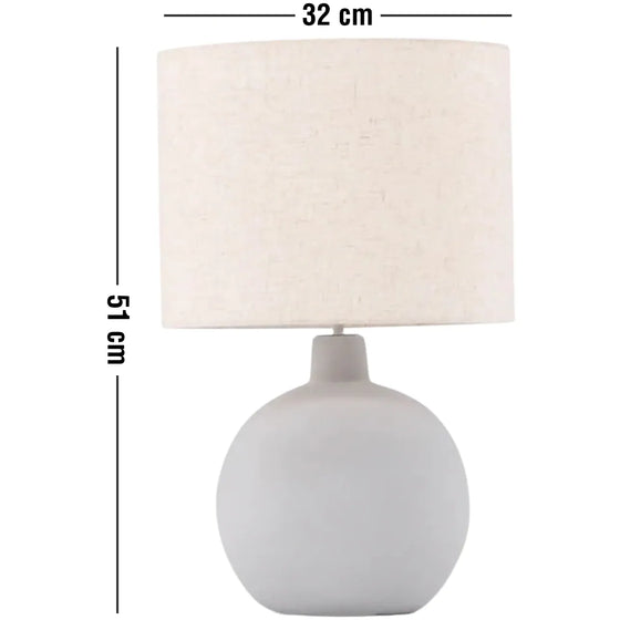 Lampefoden har en afrundet form og kan fås i hvid eller grå beton, der passer perfekt til den elegante lampeskærm i hørstof.