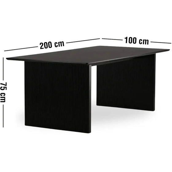 Vali spisebordet har lige nordiske former og er lavet af slidstærkt MDF - lige så stilfuldt som det er praktisk! Bordpladen er tynd i et rektangulært design og balancerer på to robuste træbrædder, der danner basen. Den sodsorte farve er nem at matche med andre møbler og vil holde i længden.