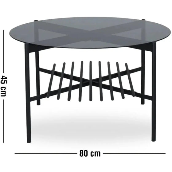 Dette sofabord har et moderne design med en rund bordplade i røgfarvet glas og en dekorativ ramme i sort metal. Der er også en stilfuld hylde i et industrielt look, der er perfekt til ekstra opbevaring eller smukke dekorationer.